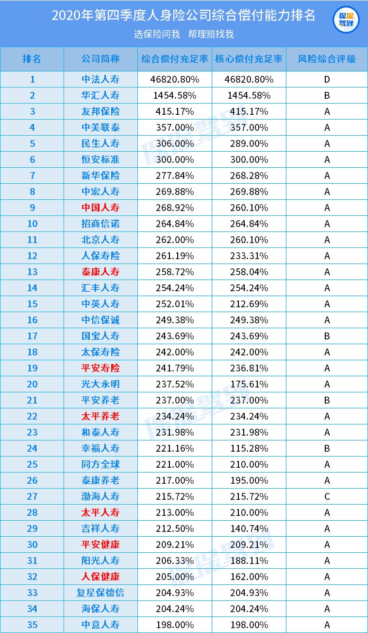 下面是以2020年綜合償付充足率排序的數(shù)據(jù):