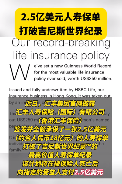 比如今年2月,匯豐保險在香港簽發(fā)了一張2.5億美元(約合人民幣18億元)的人壽保單,