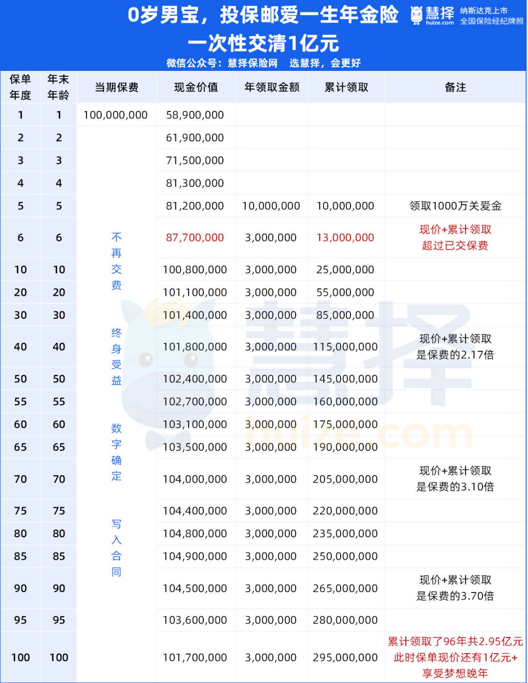這張郵愛一生年金險保單,據(jù)說是為剛出生的0歲寶寶投保,家長一次性躉交了一個億。